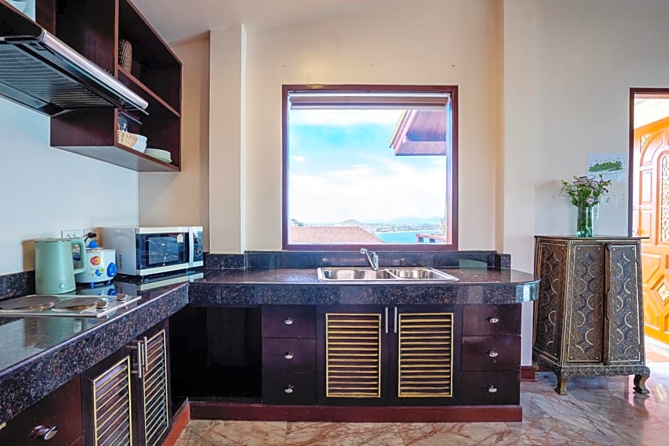 Offering panoramic ocean views from every room, this 2-bedroom villa features a 40-sqm private infinity-edge pool with sun loungers. The outdoor living area includes a dining table and lounge chairs. Complete with a vaulted tea wood ceiling, the indoor living room has a 48-inch flat-screen TV, a separate dining area and a modern kitchen. Large glass sliding doors lead directly to the pool and deck area. It has a marble bathroom with a shower.